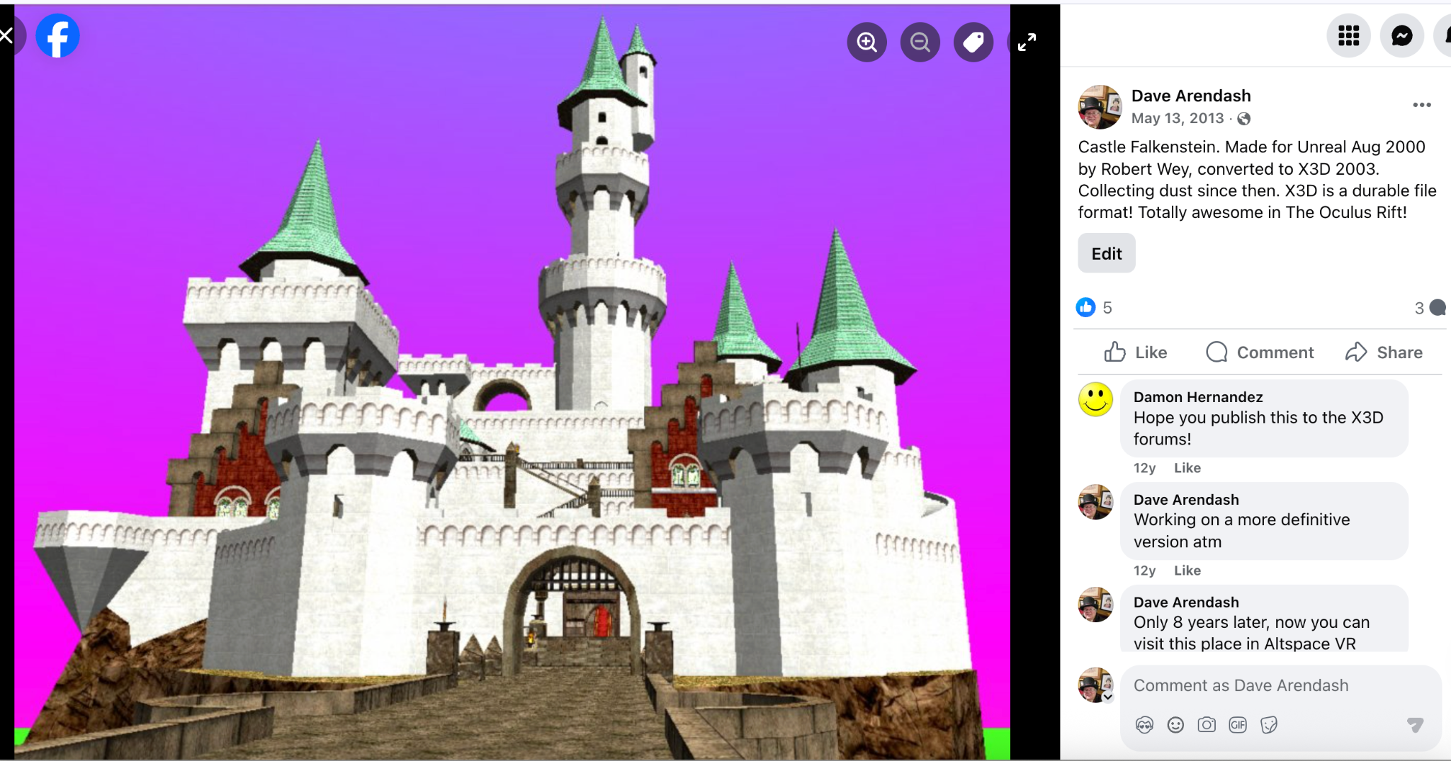 Ten years earlier, I’d coded up an Unreal-To-VRML (X3D) program. This was the original old-school Unreal Editor stuff. I’d found this lovely castle someone had built. I converted it to X3D and had fun using various VRML players to show it off on the web. After collecting dust, and writing an X3D-to-Unity converter, I was able to import this to Unity and run it in the DK1. I do sometimes revisit this and have it in Quest 3 standalone, it was on Altspace, and maybe going to VRChat or some such some day.