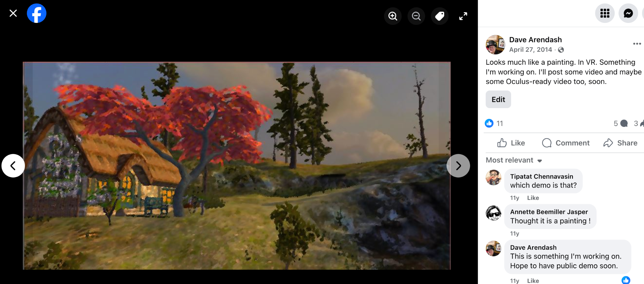 I loved that movie. I thought it would be nice to ‘be’ in a Serat or a Monet painting. I used stock parts from Unity, their Asset Store, and some online 3D repo long forgotten to assemble this Thomas Kinkade world. I used a screen-space post effect to make it look like an impressionistic painting. This was running off a mid-range laptop in 2014 into a DK1, and it worked pretty well if I do say so myself. I added smoke and waterfalls and ambient audio to help bring it to life